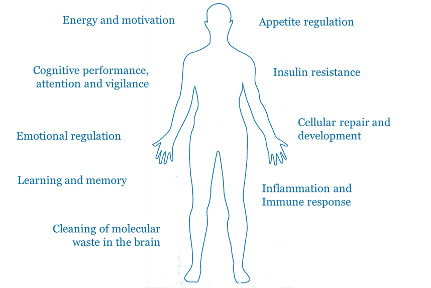 The more common symptoms of insufficient sleep is increased daytime sleepiness and a reduced level of alertness throughout the day. Sometimes these can even persist for a few days following sleep loss. However, sleep is also known to play a role in a plethora of functions, where lack of sleep can increase the risks and outcomes on our physical health, mental health, performance and overall well-being. The following outlines just a few of the known areas of impacts of insufficient sleep.